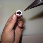 Preparate i lamponi pucciandoli delicatamente nello zucchero a velo e farcendoli con la confettura rimasta. Posizionateli in maniera circolare, o secondo il vostro gusto all’interno delle coppette e ultimate i bicchierini cioccolato lamponi e zenzero aggiungendo ancora qualche briciola, delle gocce del succo dello zenzero e una fogliolina di menta al centro.