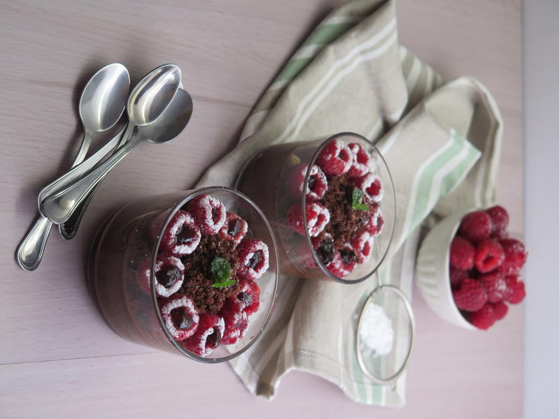Adesso vi racconto una storia… la storia dei bicchierini cioccolato lamponi e zenzero. Alcuni giorni fa avevo invitato le mie amiche a cena allora pensando al dessert avevo immaginato di preparare una torta morbida, farcita con un cremoso al cioccolato e decorata con i lamponi freschi. Tutto procedeva per il verso giusto, la torta era in forno, il cremoso pronto… erano le 22:30 loro sarebbero arrivate l’indomani, la mia idea era quella di sfornare la torta capovolgerla farcirla con il cremoso e lasciarla raffreddare completamente. Sforno la torta e sembrava bellissima, ancora fumante emanava un fantastico profumo di cioccolato, allora decisi di capovolgerla subito. Sapevo che non sarebbe stata una buona idea, la fretta non è mai amica della pasticceria, quindi anche se in cuor mio sapevo che sarebbe successo l’irrimediabile ho provato lo stesso facendo uno dei miei disastri, il dolce troppo caldo e morbidissimo ovviamente si è rotto in due pezzi. Provo a recuperare affiancando le due parti, ma non era assolutamente il risultato che volevo ottenere. Non avevo tempo di rifare un’altra torta allora decisi di rimediare al mio errore creando dei bicchierini con gli stessi ingredienti, arricchendoli con dello zenzero semi candito e vi assicuro che il risultato è stato veramente sublime, forse più della torta. La mia amica Aurora fotografò i miei bicchierini cioccolato lamponi e zenzero, merito suo se la foto finale è così bella… la cena andò a meraviglia e nessuno si accorse del mio errore fino a quando non lo rivelai io stessa 🙂