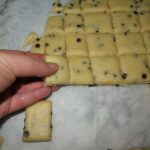 Trasferite il composto su un piano e lavoratelo ancora pochi istanti senza aggiungere farina. Stendete il panetto tra due fogli di carta forno, in modo da ottenere uno spessore di circa 0.8 mm. Adesso con un coltello affilato ricavate delle strisce larghe circa 2,5 cm, prima in un senso e poi nell’altro, in modo da ottenere dei quadrotti.