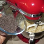 Aggiungete poi le uova una alla volta, aspettando che siano ben assorbite prima di aggiungerne ancora. Incorporate poi la farina in una volta sola, abbassando la velocità della macchina per non farla volare ovunque. Unite il lievito e le gocce di cioccolato.