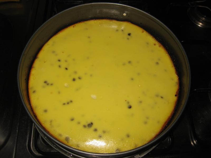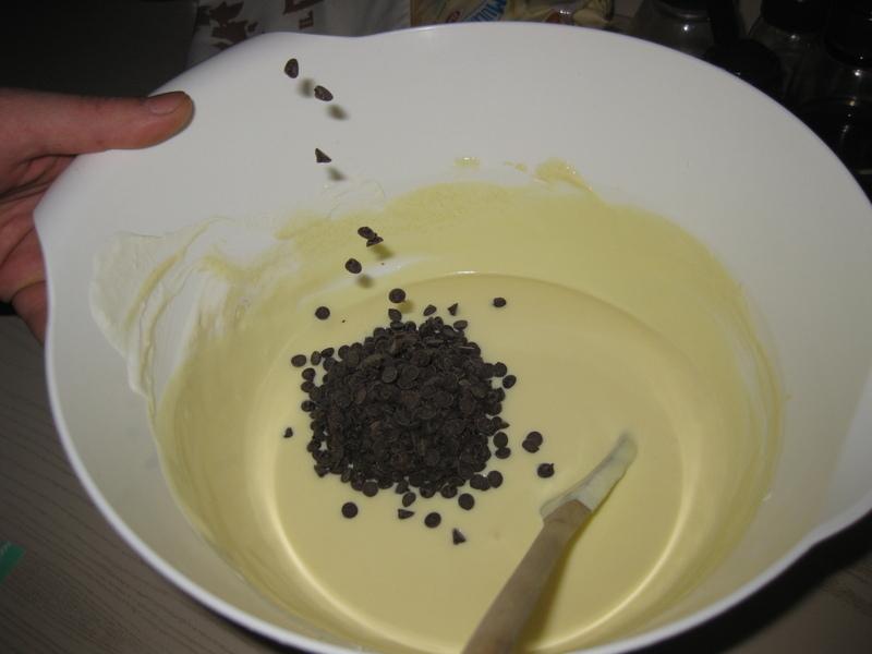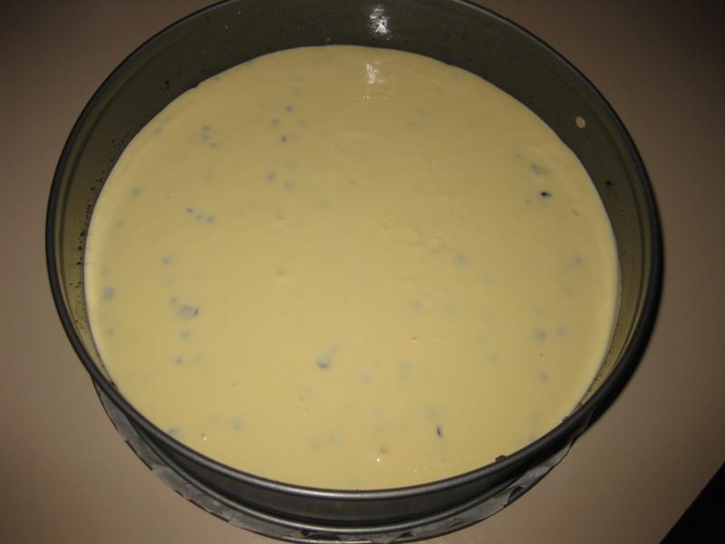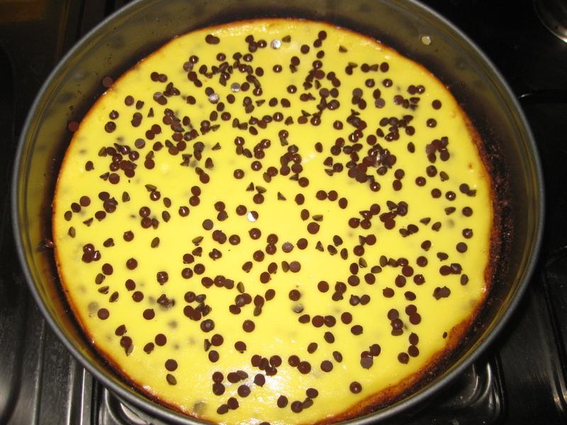 Riprendere la base al cioccolato e versarvi il composto appena preparato ed infornare a 180° per circa 30 minuti. Quindi lasciare intiepidire e decorare con le gocce di cioccolato rimaste. Riporre in frigorifero per almeno 2 ore prima di servire.