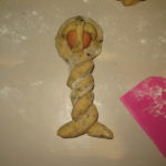 Lavorate rapidamente il composto con le mani aggiungendo un po’ di farina, se dovesse risultare troppo appiccicoso. Non mettetene troppa altrimenti risulteranno duri. Dividete il composto in 5 pezzi da 350 grammi. Prendete il primo e ricavate un filone spesso un paio di cm. Lavate le uova, asciugatele. Adesso componete i cuculi: fate passare il filone dietro all’uovo e intrecciatelo al di sotto.