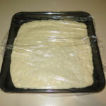 Trasferite in una ciotola e coprite con pellicola. Lasciate lievitare per 8 ore a temperatura ambiente, l’impasto dovrà quasi triplicare di volume. Trasferite quindi l’impasto in una teglia quadrata da 35 cm, leggermente unta. Non ungetela troppo altrimenti avrete difficoltà a stendere l’impasto. Allargate quindi l’impasto sollevandolo delicatamente e tirandolo. Se la pasta fa restistenza fermatevi, aspettate pochi minuti e proseguite fino a riempire l’intera teglia.