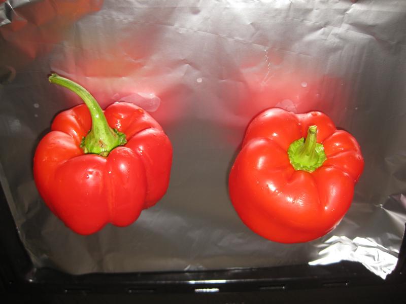 Lavare i peperoni e posizionarli su una teglia da forno, quindi infornare per 40 min a 250°. Spegnere il forno e lasciarli dentro per 15 minuti. A questo punto passarli in una bustina di quelle che si usano per congelare i cibi e chiuderla; in questo modo la pelle verrà via facilmente.