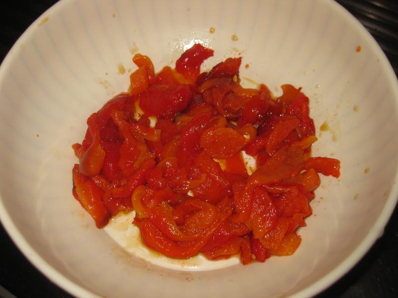 Dopo averli spellati, sfilettarli e metterli in una terrina. Rompere le uova e sbatterle insieme ai peperoni, aggiungere il sale e il pepe nero.