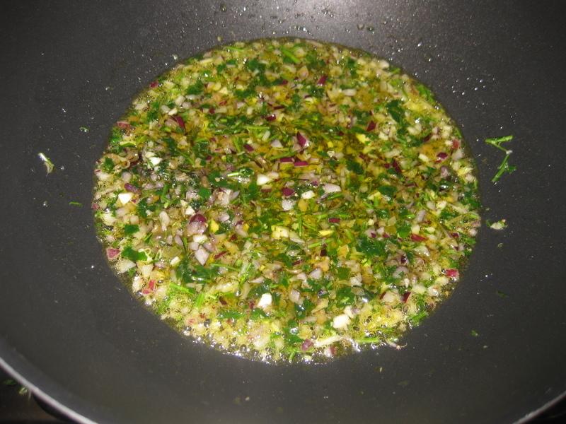 Per realizzare le linguine alle seppie fare un trito con aglio, cipolla, prezzemolo e capperi (se sono sotto sale lasciarli in acqua per una decina di minuti e sciacquarli bene). Quindi soffriggere il tutto con un filo d’olio possibilmente in una wok, o in una padella profonda, e a fuoco non troppo alto in modo da non far bruciare l’aglio.