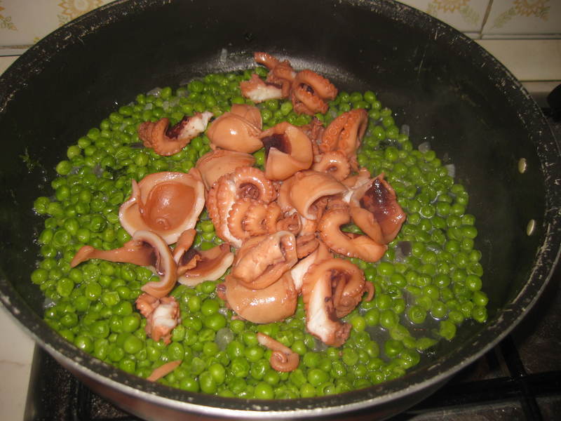 Dopodiché prendere i moscardini, che intanto avranno terminato la cottura,tagliarli a pezzi della grandezza desiderata e aggiungerli ai piselli con la passata di pomodoro e un bicchiere di acqua. Far cuocere per altri 15 minuti finchè il brodo non si sarà asciugato e aggiustare di sale e pepe.