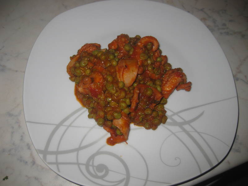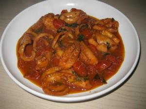 Evaporato totalmente il vino aggiungere i pomodorini ben lavati e tagliati a metà. Lasciar cuocere per un’ora aggiungendo un mezzo bicchiere di acqua calda se il sugo diventa troppo denso. Servire i moscardini in guazzetto ben caldi.