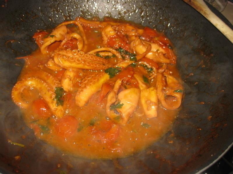 Per prima cosa pulire i moscardini, togliendo l’osso che sta in mezzo ai tentacoli e l’interno della testa. Soffriggere in una wok 2 spicchi d’aglio con un filo d’olio.
