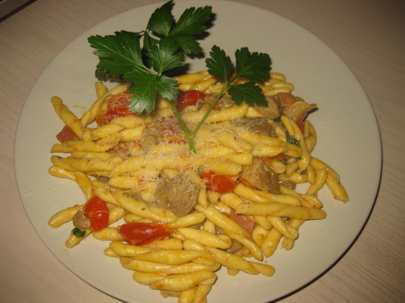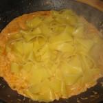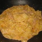 Scolate la pasta al dente, senza eliminare troppo l’eccesso di acqua. Aggiungetela in padella e saltatela bene con il resto del condimento, fino a che non sarà ben amalgamata e condita. Servitela subito, ben calda. Potete decorare con del prezzemolo tritato.