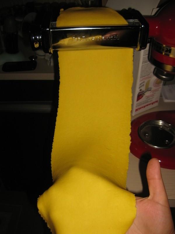 Una volta fatta la pasta all’uovo lasciarla riposare avvolta nella pellicola in frigorifero per circa mezz’ora. A questo punto stendere la sfoglia molto sottile, io l’ho fatta con il mio kitchenaid sono partita dallo spessore 1 ripiegandola un paio di volte, fino ad arrivare allo spessore 5.