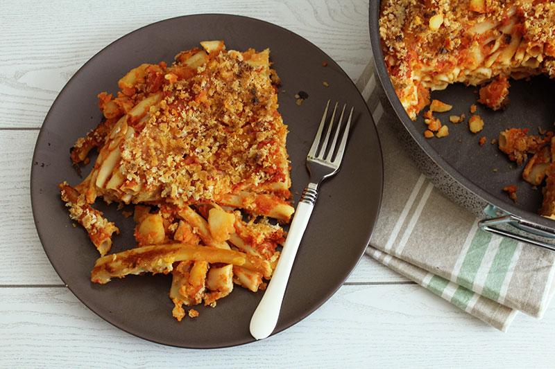 Disponete poi all’interno di una teglia capiente, aggiungete i pezzetti di formaggio, il sugo rimasto e la mollica sbriciolata. Irrorate con un filo d’olio e cuocete in forno statico a 200° per circa 30 minuti. Azionate poi il grill negli ultimi 5 minuti. Sfornate e servite la vostra pasta e patate ara tijeddra ancora calda!
