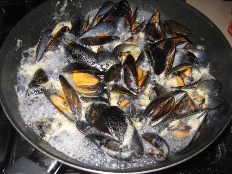 In una wok soffriggere gli spicchi d’aglio con un filo d’olio. Quindi aggiungervi le cozze già pulite e cuocere a fiamma alta per 6 o 7 minuti finchè non saranno ben aperte.