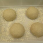 4. Trasferite in una ciotola leggermente unta e lasciate lievitare per circa 5 ore a temperatura ambiente, coprendo la ciotola con pellicola per non farla seccare. A questo punto trasferite l’impasto su un piano e dividetelo in 4 porzioni da 280 g l’uno. Poi date un paio di pieghe a ciascuna porzione e formate delle palline.