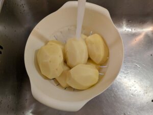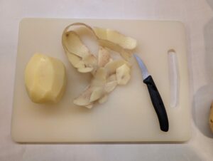 • Per preparare le salsicce e patate al forno come prima cosa sbucciate le patate.