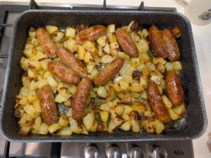 • Cuocete per altri 5 minuti sotto al grill sino a che non sarà tutto ben rosolato. Le salsicce e patate al forno sono pronte da servire!