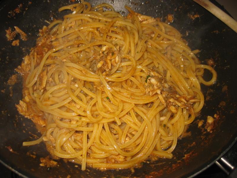 Prima di scolare la pasta aggiungere al sughetto un mestolo di acqua di cottura. Aggiungervi la pasta, un filo d’olio, altro prezzemolo tritato e spadellare. Servire gli spaghetti con le alici ben caldi.
