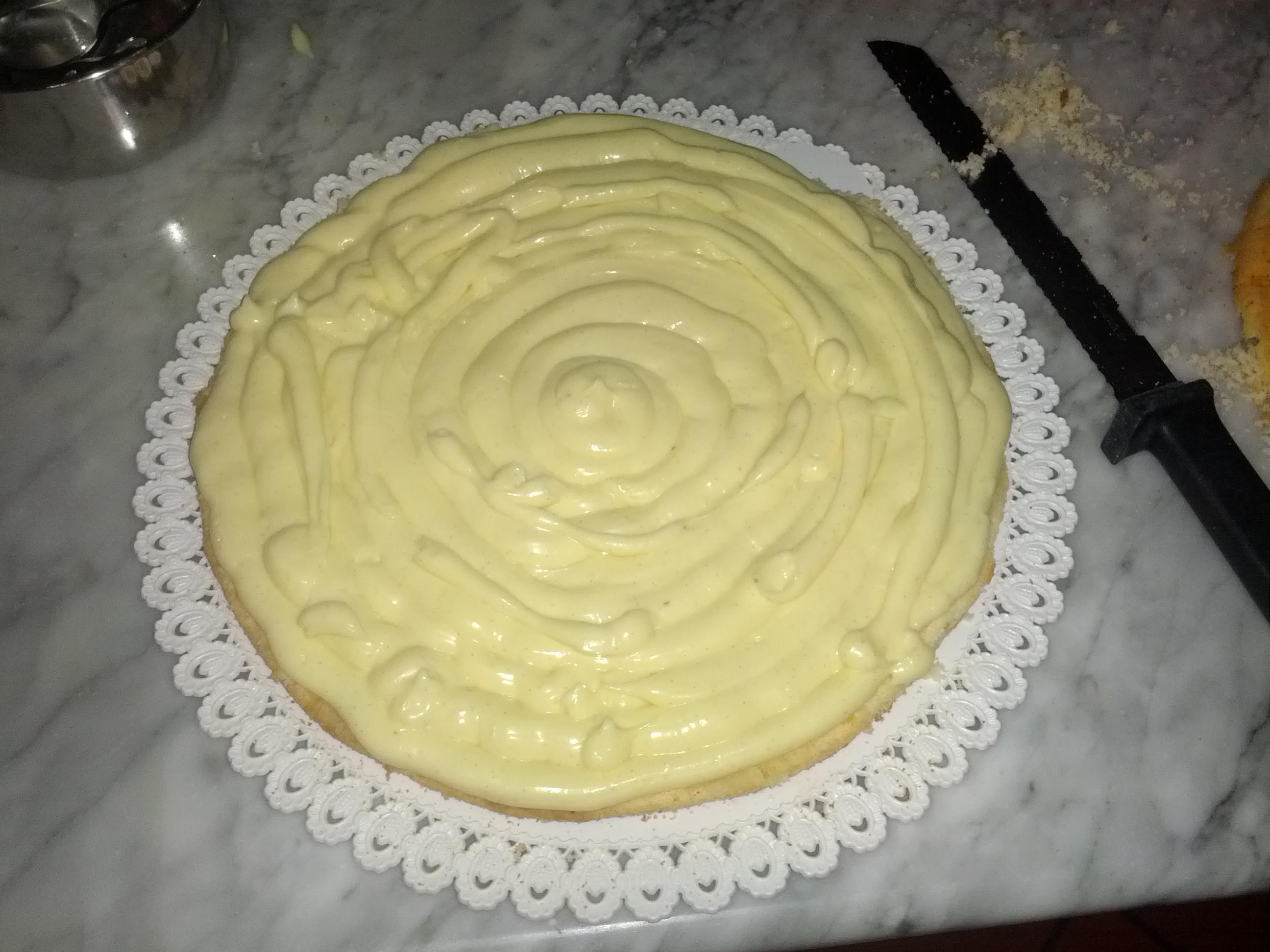 Versare il composto in una tortiera imburrata ed infarinata di diametro 30 cm. Infornare in forno caldo a 180° per almeno 30 minuti. Non aprire mai il forno prima dei 25 minuti ed in ogni caso fare la prova dello stuzzicadenti. Una volta cotta la torta lasciarla raffreddare capovolta, in modo da ottenere un pan di spagna piatto. Nel frattempo preparare la crema. Mettere a bollire il latte insieme alla vaniglia e ai semi da essa prelevati. In una ciotolina unire le uova insieme a zucchero, maizena e sbattere subito con un frustino.
