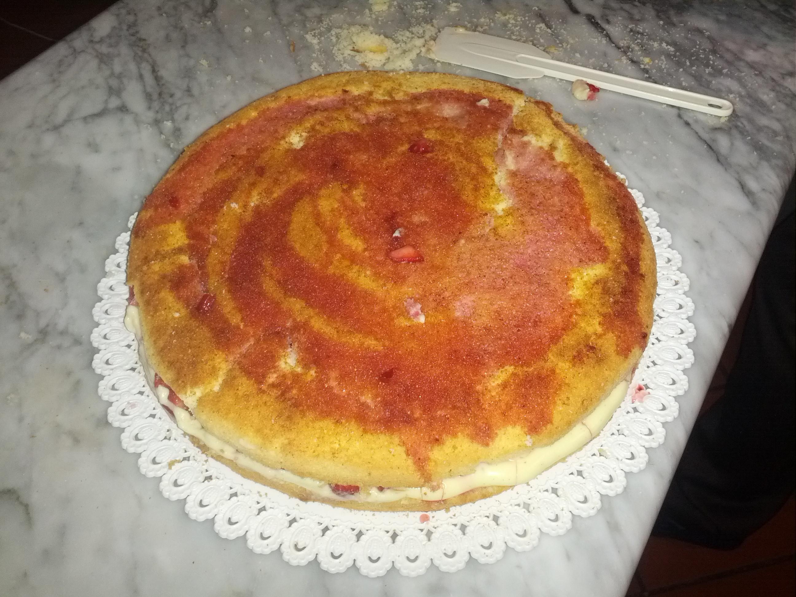 A questo punto anche il pan di spagna si sarà raffreddato, con un coltello togliere la parte marroncina, quella più esterna. Tagliarlo in due dischi. Bagnare il primo disco con la bagna precedentemente preparata. Versarvi un abbondante strato di crema. Aggiungere le fragole e un altro pò di crema.