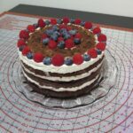 Sistemate circa metà del cioccolato tritato e ancora un po’ di crema. Realizzate ancora un altro strato ripetendo queste ultime operazioni, tenendo da parte un po’ di cioccolato per la decorazione finale. Coprite con l’ultimo disco di pan di spagna, inumidite anche questo e create uno strato abbondante di crema. Livellate bene la superficie e riponete in frigorifero per 2-3 ore. Poi estraete il disco, eliminate delicatamente l’acetato e decorate con frutti di bosco e cioccolato a piacere.