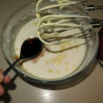 Incorporate le polveri con le fruste a velocità bassa. Aggiungete poi il latte e l’estratto di vaniglia. Mescolate ancora lentamente.