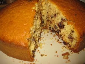 A questo punto spezzettare il cioccolato (vanno bene anche le gocce) e unirlo al composto. Mescolare di nuovo per amalgamare il tutto e versarlo in un ruoto (da 24 cm di diametro) precedentemente imburrato e infarinato, quindi infornare a 180° per 40 min sul ripiano medio/basso del forno. Fare sempre la prova dello stuzzicadenti per verificare il grado di cottura.