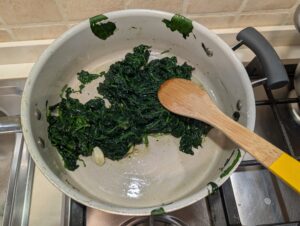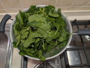 - Coprite con un coperchio e lasciate cuocere a fiamma bassa per una decina di minuti o comunque sino a che gli spinaci non saranno appassiti. Se dovesse essere necessario potete aggiungere un goccio d'acqua.