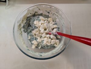 - Mescolate ancora sino ad ottenere un composto omogeneo, poi aggiungete la mozzarella tagliata a cubetti. Mescolate ancora.