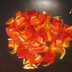 Per prima cosa tagliare la cipolla a fettine e farla soffriggere con 2 cucchiai di olio. Nel frattempo lavare i peperoni, privarli dei filamenti interni e dei semi, tagliarli a cubetti e unirli in pentola. Quindi aggiungere un pizzico di sale e lasciar cuocere per una decina di minuti. Quindi tagliare anche la melanzana e la zucchina a cubetti non troppo piccoli e unirli. Aggiustare di sale, aggiungere un pizzico di pepe nero e lasciar cuocere per una ventina di minuti a fuoco medio, coperto, girando di tanto in tanto.